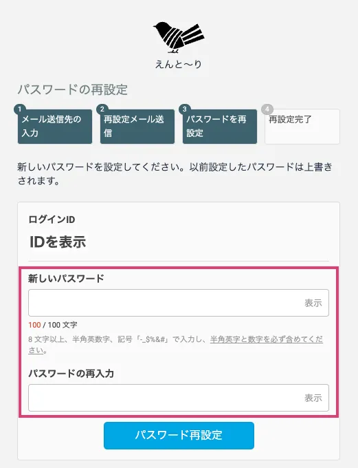 Section titled “4. 再設定パスワードの入力”再設定画面にて新しいパスワードをご入力して、【パスワード再設定】ボタンを押してください。
