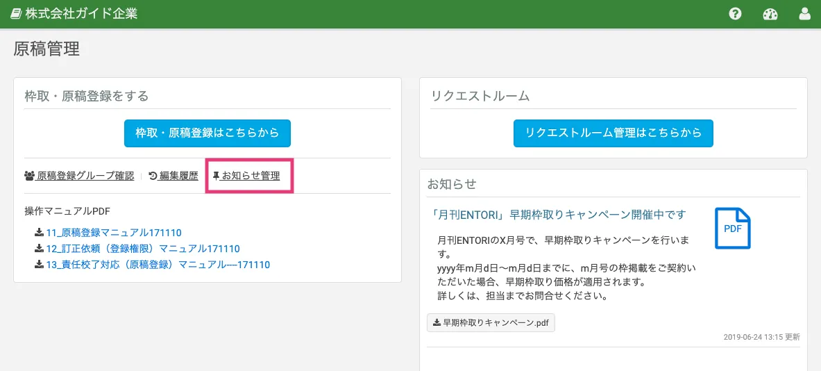 登録されたお知らせは、原稿登録ユーザー及び、校閲ユーザーの原稿管理のトップページに表示されます。