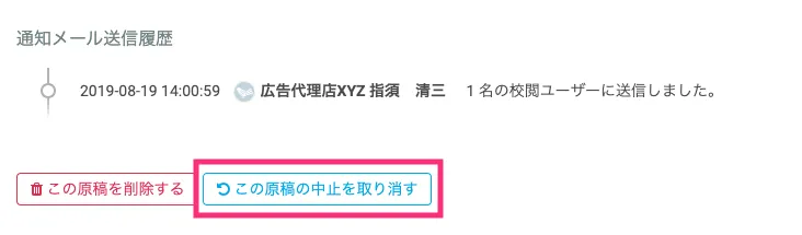 Section titled “原稿の中止を取り消す”一度中止された原稿は中止にした同操作手順から中止を取り消すことができます。
